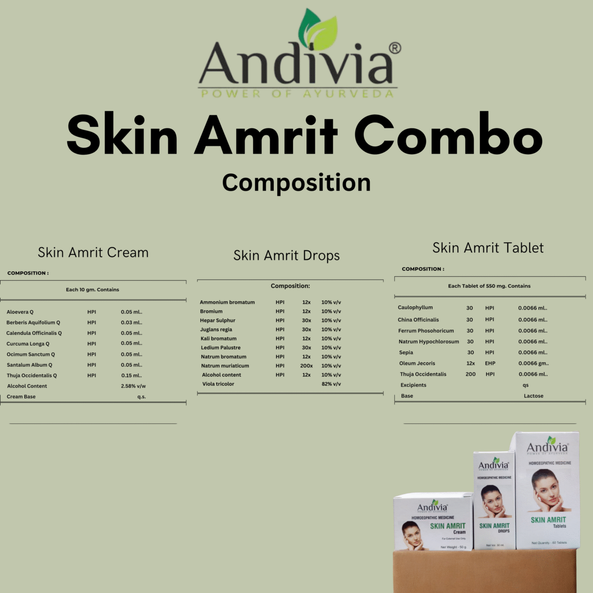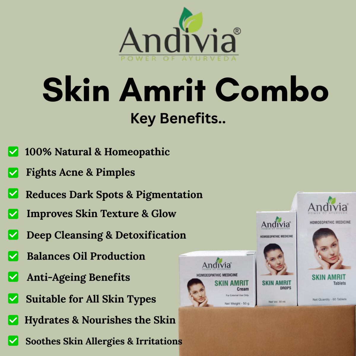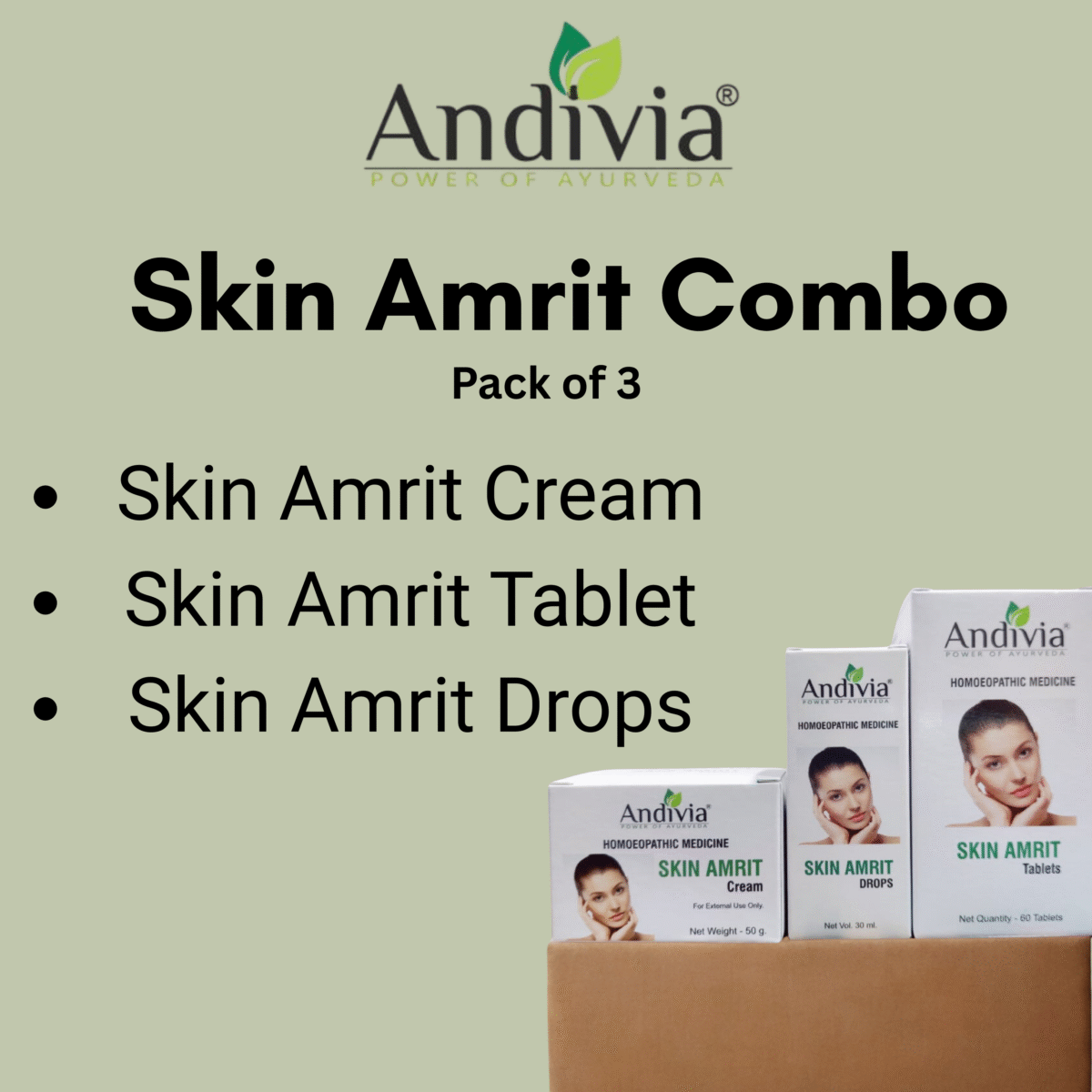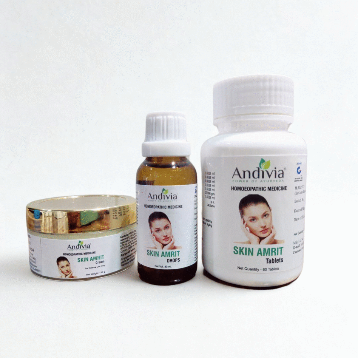 Andivia Skin Amrit Combo Pack of 3 is a powerful skin care solution designed to restore your natural glow using the healing touch of nature. This all-in-one combo includes Skin Amrit Drops, Skin Amrit Tablets, and Skin Amrit Cream – each formulated with 100% natural and homeopathic ingredients. Together, they work from the inside out to cleanse, nourish, and rejuvenate your skin.